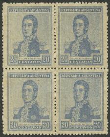 44 ARGENTINA - EMISIONES GENERALES Cuadro / Nuevo o Nuevo Mint N°Cat.: GJ.491 Valor de catál.: US$400 MB. GJ.491, 1918 20c. San Martín con filigrana Wheatley Bond, cuadro, LOS 4 SELLOS TIENEN FILIGRANA, muy raro así, MB, valor de catálogo US$400 Precio inicial: US$ 200 Precio actual: US$ 200 Oferte US$ 221 o más | |