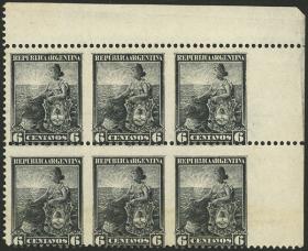 41 ARGENTINA - EMISIONES GENERALES Multiplo / Nuevo Mint N°Cat.: GJ.245PV Valor de catál.: US$675 MB. GJ.245P, 1899 6c. Libertad con Escudo con dentado 12, bloque de 6 esquina de hoja SIN DENTADO VERTICAL, nuevo mint (+50%), raro y espectacular! Precio inicial: US$ 400 Precio actual: US$ 400 Oferte US$ 441 o más | |