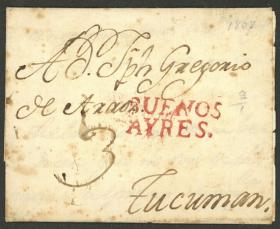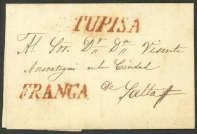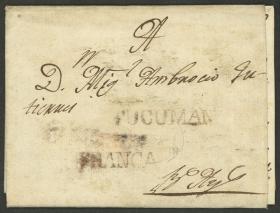 73 ARGENTINA - PREFILATELIA Sobre / N°Cat.: GJ.TUC 3, 4 MB. Carta completa enviada el 18/MAY/1817 a Buenos Aires con las marcas lineales "TUCUMAN" y "FRANCA" (GJ.TUC 3 y 4) en color castaño rojizo, firmada por Victor Kneitschel y de muy buena calidad. El texto de la carta es comercial e incluye un párrafo muy importante mencionando "la retirada del enemigo de Salta, dicen que ha saqueado aquel pueblo y que han birlado algunas mujeres, profanado templos", etc. También menciona el "sitio riguroso de Jujuy...". Incluímos un fragmento con la marca "FRANCA" en color rojo. Precio inicial: US$ 50 Precio actual: US$ 50 Oferte US$ 56 o más | |