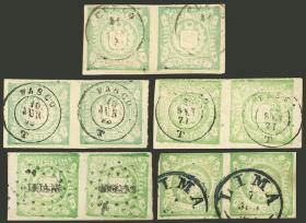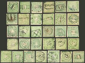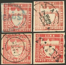 322 PERÚ - EMISIONES GENERALES Lote / Usado N°Cat.: Sc.14 MB. Sc.14, 1868 1d. Verde, varios tonos de color, 31 sellos con matasellos diferentes, entre otros: Chincha, Chiclayo, Yquitos, Iquique, Jauja, Paita, Lima (varios diferentes), Puno, Tacna, Yca, etc., muy buena calidad general! Precio inicial: US$ 100 Precio actual: US$ 100 Oferte US$ 111 o más | |