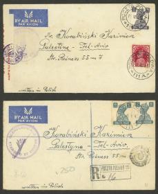 380 POLONIA - HISTORIA POSTAL Sobre / N°Cat.: MB. FUERZAS POLACAS EN EL EJÉRCITO INGLÉS: par de sobres enviados a Palestina en 1943, están franqueados con sellos de India y con matasellos "POCZTA POLOWA 111 y 111A", ambos por correo aéreo y censurados, muy interesantes, MB calidad! Precio inicial: US$ 100 Precio actual: US$ 100 Oferte US$ 111 o más | |
