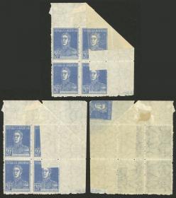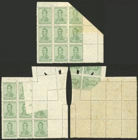 47 ARGENTINA - EMISIONES GENERALES Multiplo / Nuevo o Nuevo Mint N°Cat.: GJ.546CD+var. MB. RARO IMPRESO SOBRE GOMA: GJ.546, 1922 3c. San Martín, gran bloque de 9 sellos + complementos, esquina de hoja, con notable variedad: la esquina de la hoja se dobló antes de imprimir y un sello y parte de otros quedó en blanco, impresa al dorso SOBRE LA GOMA, muy buena calidad, muy raro! Precio inicial: US$ 150 Precio actual: US$ 150 Oferte US$ 165 o más | |