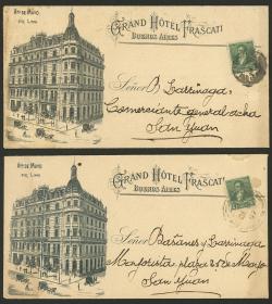 79 ARGENTINA - HISTORIA POSTAL Sobre / N°Cat.: MB. Par de sobres enviados en DIC/1897 a San Juan, ambos con espectacular membrete ilustrado del GRAND HOTEL FRASCATI, muy buena calidad, posiblemente sean los más lindos membretes de hotel antiguos! Precio inicial: US$ 100 Precio actual: US$ 100 Oferte US$ 111 o más | |