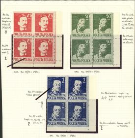 368 POLONIA - EMISIONES GENERALES Cuadro / Nuevo Mint N°Cat.: Yv.427/9 Valor de catál.: Euros 1.000+ MB. Yvert 427/429, 1944 R. Traugutt, la serie de 3 valores en cuadros esquina de hoja inferior derecha (posiciones 24/25-29/30), nuevos mint (emitidos sin goma), con pequeñas variedades señaladas, excelente calidad! Precio inicial: US$ 200 Precio actual: US$ 286 Oferte US$ 315 o más | |