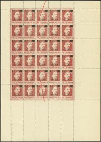 370 POLONIA - EMISIONES GENERALES Multiplo / Nuevo Mint N°Cat.: Yv.437 Valor de catál.: Euros 1.800+ MB. Yvert 437, 1945 5z. sobre 25g. rojo, insurrección de Traugutt, HOJA COMPLETA de 30 sellos nuevos mint (emitidos sin goma), con un par de pequeñas variedades señaladas, excelente calidad, rara! Precio inicial: US$ 500 Precio actual: US$ 850 Oferte US$ 936 o más | |