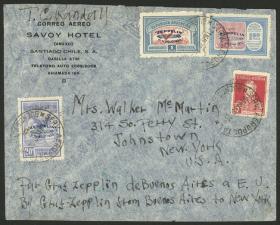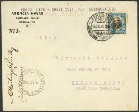 91 ARGENTINA - HISTORIA POSTAL - VUELOS Sobre / N°Cat.: Buena-MB 21/MAY/1930 Santiago de Chile - Buenos Aires - New York, sobre transportado por Zeppelin con buen franqueo y marca de arribo en verde al dorso. Tiene membrete del "Savoy Hotel" de Santiago, y contiene su carta original donde el remitente explica que, enterado de la partida del Graf Zeppelin desde Buenos Aires hacia USA intentaría hacer llegar algunas cartas para que viajaran en la aeronave, entregándoselas a un piloto de la N.Y.R.B.A. para que las despache en Buenos Aires, MB calidad, muy interesante. Ex-Loeb (su precio de venta US$900) Precio inicial: US$ 300 Precio actual: US$ 300 Oferte US$ 330 o más | |
