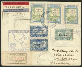 319 PARAGUAY - HISTORIA POSTAL Sobre / N°Cat.: 9340818 MB. 18/AGO/1934 Asunción a New York, sobre certificado enviado vía Zeppelin con muy lindo franqueo, etiquetas y marcas especiales, al dorso tiene tránsito por Friedrichshafen el 28/AGO y arribo a New York el 6/SEP, muy buena calidad! Precio inicial: US$ 100 Precio actual: US$ 100 Oferte US$ 111 o más | |