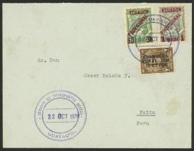 204 ECUADOR - HISTORIA POSTAL Sobre / N°Cat.: MB. 7/DIC/1928 Guayaquil a Italia, interesante sobre transportado por SCADTA, con franqueo multicolor que incluye Sc.C4 (1½S. sobre 30c.), al dorso tiene tránsito por Barranquilla y arribo. Al llegar le aplicaron estampillas de tasa por 25c., MB calidad! Precio inicial: US$ 200 Precio actual: US$ 240 Oferte US$ 264 o más | |