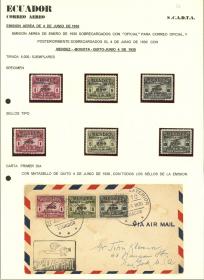 200 ECUADOR - CORREO AÉREO Lote / N°Cat.: Sc.C32/34 MB. Sc.C32/C34, 1930 Vuelo del Capitán Benjamín Méndez, la serie de 3 valores con sobrecarga manual SPECIMEN (sin goma) + una serie normal (con goma), y un sobre con matasello PDE, todo montado en una hoja de la famosa colección "Bustamante", muy buena calidad! Precio inicial: US$ 100 Precio actual: US$ 100 Oferte US$ 111 o más | |