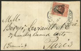424 URUGUAY - HISTORIA POSTAL Sobre / N°Cat.: MB. Cubierta enviada de Montevideo a Francia con franqueo de 60c. (Sc.41 + 43) con matasello semimudo "A" entre 5 barras, marcas de tránsito, tasas y arribo al dorso el 4/FEB/1878, excelente calidad! Precio inicial: US$ 300 Precio actual: US$ 300 Oferte US$ 330 o más | |