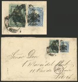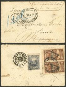 354 PERÚ - HISTORIA POSTAL Sobre / N°Cat.: MB. QUÍNTUPLE PORTE y espectacular combinación de franqueo: Sobre enviado de Lima a Paris el 16/ENE/1886 con franqueo de 55c. formado con un sello de 50c. con sobrecarga triángulo (Sc.71) + 5c. con sobrecarga "sol y CORREOS LIMA" (Sc.103), con arribo a Francia el 22/FEB (al frente), muy buena calidad, rara, ex-Herbert Moll. Precio inicial: US$ 750 Precio actual: US$ 750 Oferte US$ 826 o más | |