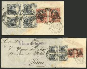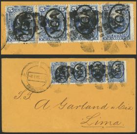 353 PERÚ - HISTORIA POSTAL Sobre / N°Cat.: MB. CUÁDRUPLE PORTE A FRANCIA: Sobre enviado de Lima a Paris el 24/OCT/1885 con franqueo de 44c., tiene marca de arribo el 29/NOV, excelente calidad, ex-Herbert Moll. NOTA: Parte del franqueo estaba al dorso, por lo que fue abierto para que este se vea en su totalidad! Precio inicial: US$ 750 Precio actual: US$ 750 Oferte US$ 826 o más | |