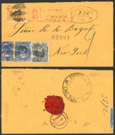 352 PERÚ - HISTORIA POSTAL Sobre / N°Cat.: MB. Sobre certificado enviado en AGO/1885 de YCA a New York con franqueo de 21c. que incluye una pareja de 5c. con sobrecarga "YCA" en color magenta y 1c. naranja con sobrecarga "triángulo", al dorso tiene tránsito por Lima el 8/AGO y arribo a New York el 3/SEP, excelente calidad, raro, ex-Herbert Moll Precio inicial: US$ 400 Precio actual: US$ 400 Oferte US$ 441 o más | |