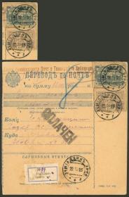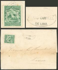 356 PERÚ - HISTORIA POSTAL Sobre / N°Cat.: MB. Sobre enviado a Moquegua y redirigido a Lima, tiene al frente una leyenda manuscrita "Con impresos La Lidia, cuatro números", y un franqueo de 10c. (Sc.110) y al lado marca circular "ESTAMPILLA USADA", marca de multa "1 Sol", fechador de Lima del 17/ENE/1894, y al dorso 2 estampillas de tasa de 50c. con sobrecarga "triángulo" (Sc.J26), excelente calidad, rara, ex-Herbert Moll Precio inicial: US$ 500 Precio actual: US$ 500 Oferte US$ 550 o más | |