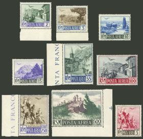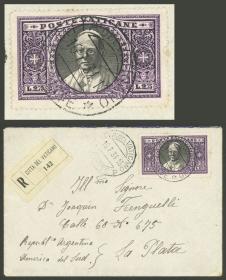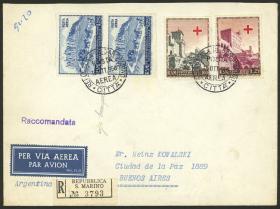 407 SAN MARINO - HISTORIA POSTAL Sobre / N°Cat.: MB. Sobre aéreo certificado enviado el 15/OCT/1956 a Argentina con muy bonito franqueo de 525L. que incluye Sassone 371 (Cruz Roja, valor alto de la serie) + pareja Sa.A96 (UPU), muy buena calidad! Precio inicial: US$ 50 Precio actual: US$ 50 Oferte US$ 50 o más | |