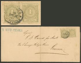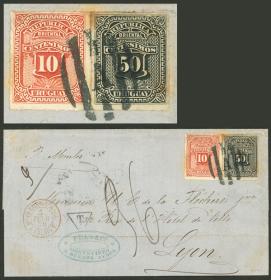 424 URUGUAY - HISTORIA POSTAL Sobre / N°Cat.: MB. Cubierta enviada de Montevideo a Francia con franqueo de 60c. (Sc.41 + 43) con matasello semimudo "A" entre 5 barras, marcas de tránsito, tasas y arribo al dorso el 4/FEB/1878, excelente calidad! Precio inicial: US$ 300 Precio actual: US$ 300 Oferte US$ 330 o más | |