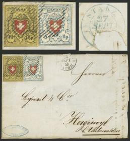 409 SUIZA - HISTORIA POSTAL Sobre / N°Cat.: MB. Frente y parte del dorso de una cubierta enviada el 26/SEP/1853 de Winterthur a Hergiswyl con franqueo de 15Rp. (Sc.8 + 10) con matasello mudo y acompaña fechador de origen, al dorso tránsito por Stanz el 27/SEP, muy bonito! Precio inicial: US$ 200 Precio actual: US$ 200 Oferte US$ 200 o más | |