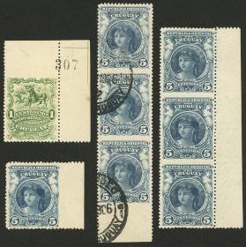 418 URUGUAY - EMISIONES GENERALES Lote / Usado o sin usar N°Cat.: Sc.154 var. Buena-MB Sc.154, 1900 5c. azul, tiras de 3 SIN DENTADO HORIZONTAL, nueva con goma y usada, además otro 5c. y el 1c. sin dentar en algún borde, MB calidad general! Precio inicial: US$ 100 Precio actual: US$ 100 Oferte US$ 100 o más | |