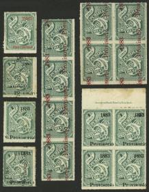 414 URUGUAY - EMISIONES GENERALES Lote / Nuevo con bisagra N°Cat.: Buena-MB Sc.52, 1883 Provisorio de 5c. verde, PRUEBAS de sobrecarga: en color rojo, tira de 4 + cuadrito con la sobrecarga desplazada + otro con la s.c. en color naranja con letras chicas, además, en negro, cuadro + 3 sellos sueltos con s.c. horizontal, doble, invertida, etc., muy buen conjunto! Precio inicial: US$ 150 Precio actual: US$ 150 Oferte US$ 150 o más | |