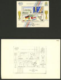 422 URUGUAY - EMISIONES GENERALES Bloque conmemorativo / N°Cat.: Sc.1092/4 MB. 1980 Torneo de fútbol Copa de Oro, diseño no adoptado de una hojita de 3 valores y boceto a lápiz en una carpeta presentada al Correo, el autor fue Medina-Medina (el mismo que diseño los 3 valores de la serie emitida (Sc.1092/1094), único y de excelente calidad! Precio inicial: US$ 250 Precio actual: US$ 250 Oferte US$ 250 o más | |
