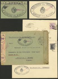 426 URUGUAY - HISTORIA POSTAL Sobre / N°Cat.: MB. RARA CENSURA: Sobre enviado el 9/FEB/1944 por un marino del acorazado de guerra alemán GRAF SPEE desde el Campo de Internados de Sarandí del Yi a un colega suyo que vivía en Rosario (Argentina) + sobre enviado con franquicia desde Alemania a otro internado en Sarandí del Yi, ambos con la rara censura que aplicaba el Ministerio del Interior Uruguayo, excelente calidad, pocos conocidos. Además incluímos un sobre enviado al marino Paul Lübeck al primer lugar de internación de estos marinos alemanes, en Timote 4600, Nuevo Paris, por su entonces novia Thea Uhlig. Lübeck fué herido durante la batalla del Río de la Plata, primero estuvo internado en este lugar y más adleante fué transladado a Sarandí del Yi. Muy buen conjunto! Precio inicial: US$ 2000 Precio actual: US$ 2000 Oferte US$ 2000 o más | |