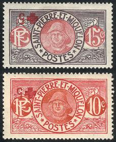 403 SAINT PIERRE ET MIQUELON - EMISIONES GENERALES Serie / Nuevo Mint N°Cat.: Yvert 105/6 var. MB. Yvert 105/6 (Scott B1/B2), 1915/7 Pro-Cruz Roja, SC de 2 valores con variedad SOBRECARGA INVERTIDA, nuevos con ínfima marquita de bisagra, excelente calidad y muy raros! Precio inicial: US$ 100 Precio actual: US$ 100 Oferte US$ 100 o más | |