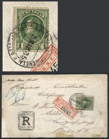 429 VENEZUELA - EMISIONES GENERALES Sobre / N°Cat.: Sc.73 Valor de catál.: US$2.000 Buena-MB Sc.73, 1880 1B. verde, franqueando un sobre certificado enviado el 2/MAR/1935 de PUERTO CABELLO a Berlin, tiene mínimos defectitos en el sobre, muy bonito y muy raro! Precio inicial: US$ 700 Precio actual: US$ 700 Oferte US$ 700 o más | |