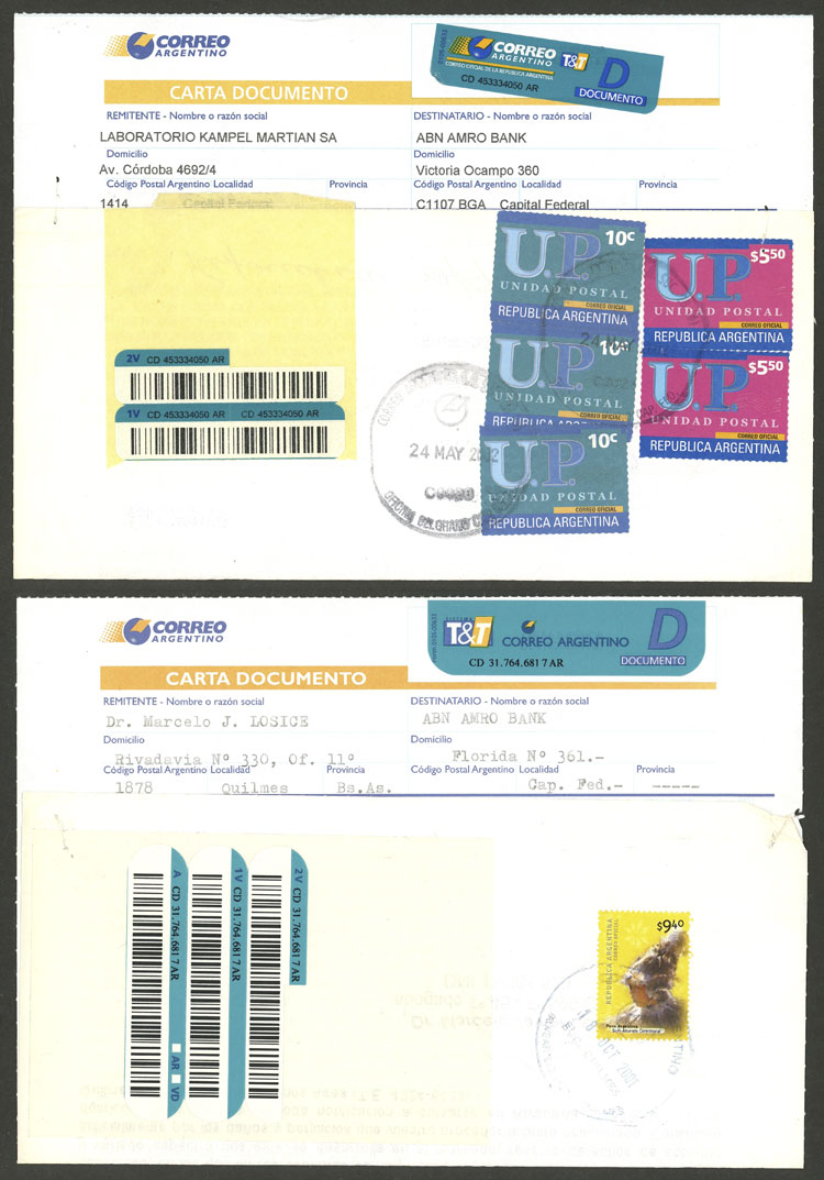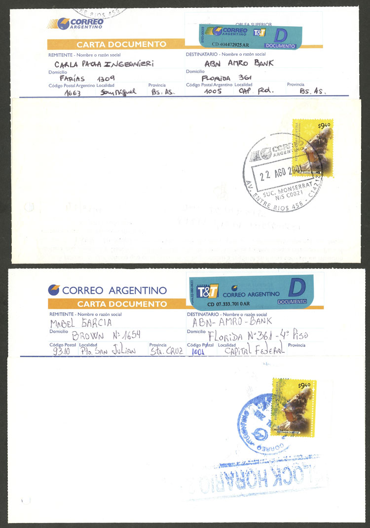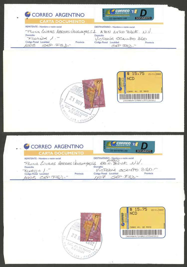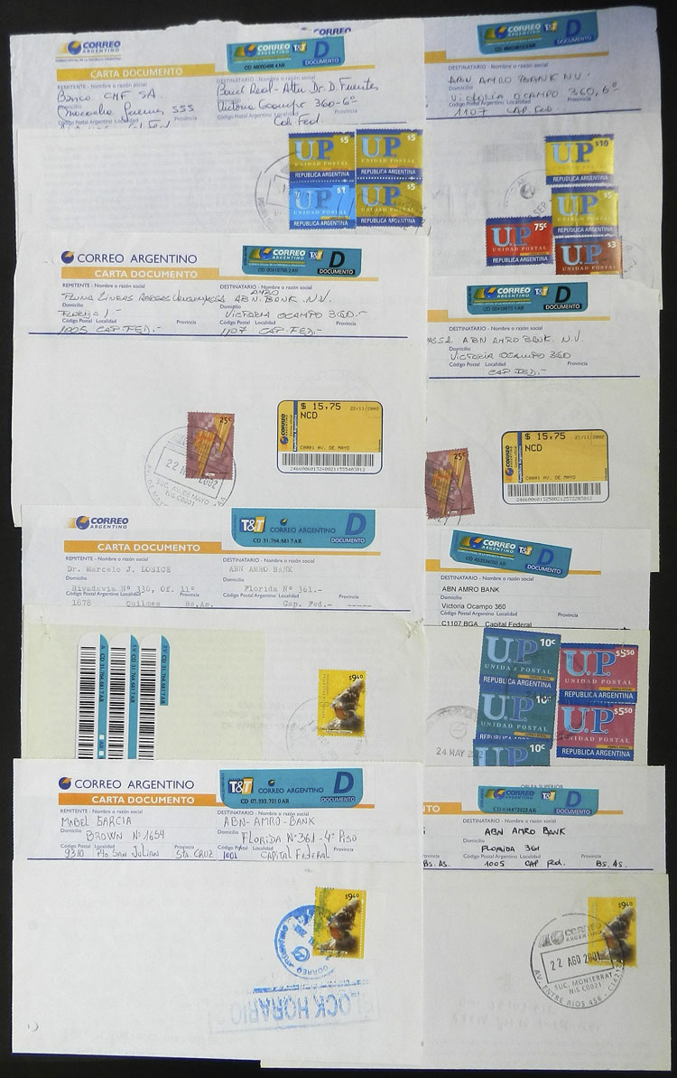 1014 ARGENTINA - HISTORIA POSTAL Remate #2538: ARGENTINA: subasta 'liquidación' con bases muy bajas y muchos lotes de interés!! Lote / Usado N°Cat.: Buena-MB 8 cartas documento enviadas entre los años 2001 y 2002, todas con atractivos franqueos, varias con sellos de U.P. Precio inicial: US$ 10 Precio actual: US$ 10 Oferte US$ 11 o más Cierre: 2025-10-09 22:15:00