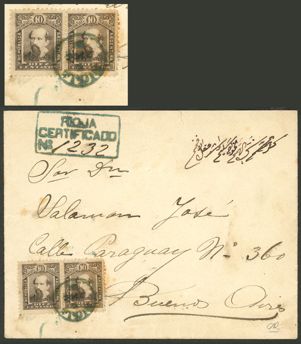 MB. GJ.110, 10c. Avellaneda en pareja franqueando un sobre certificado enviado desde LA RIOJA a Buenos Aires el 22/OCT/1891, MB y muy atractivo!