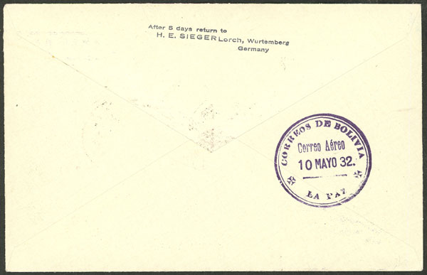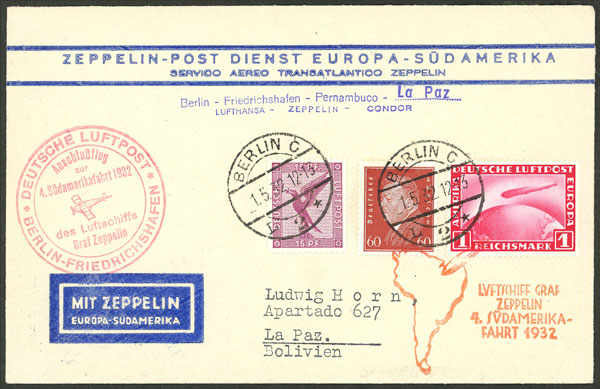 MB. Sobre aéreo enviado el 1/MAY/1932 vía Zeppelin de Berlin a Bolivia en el 4º vuelo a Sudamérica, con marcas especiales y al dorso arribo a La Paz el 10/MAY, raro destino, excelente calidad!
