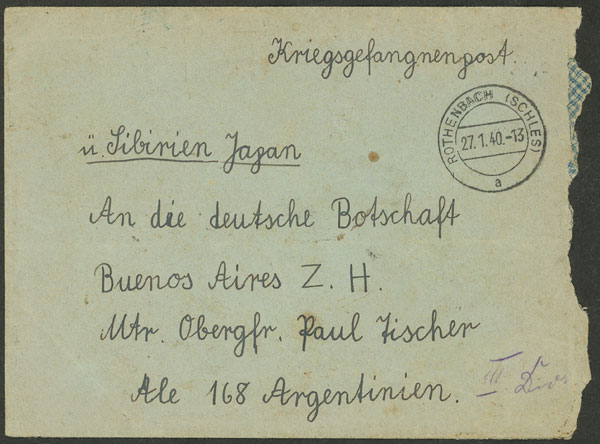 Buena-MB Sobre enviado el 27/ENE/1940 desde Rothenbach al marino (intenado de guerra) PAUL FISCHER con franquicia postal total. Fué dirigido a la Embajada Alemana en Buenos Aires para su entrega, buena calidad, raro!!