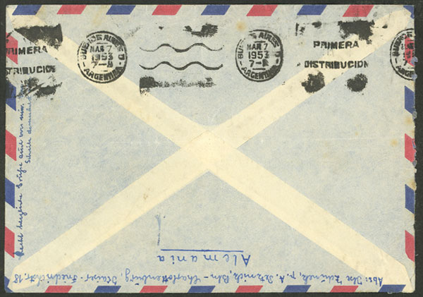 MB. Sobre aéreo enviado el 3/MAR/1953 a Argentina con muy lindo franqueo de 90Pg., arribo al dorso, MB calidad!