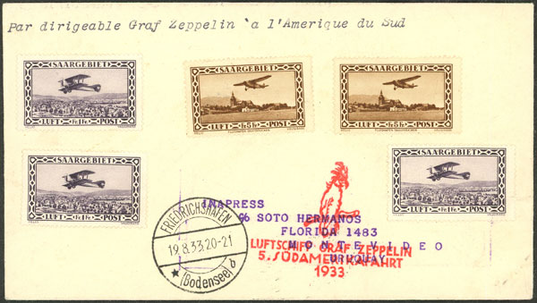 MB. Sobre enviado vía Zeppelin a Uruguay, con lindo franqueo sin matasellar en origen, tiene tránsito por Friedrichshafen el 18/SEP/1933, marca roja del 5º vuelo a Sudamérica, al dorso otras marcas, arribo a Montevideo el 26/AGO y una atractiva viñeta de la Exposición Industrial de aquel año, excelente calidad!