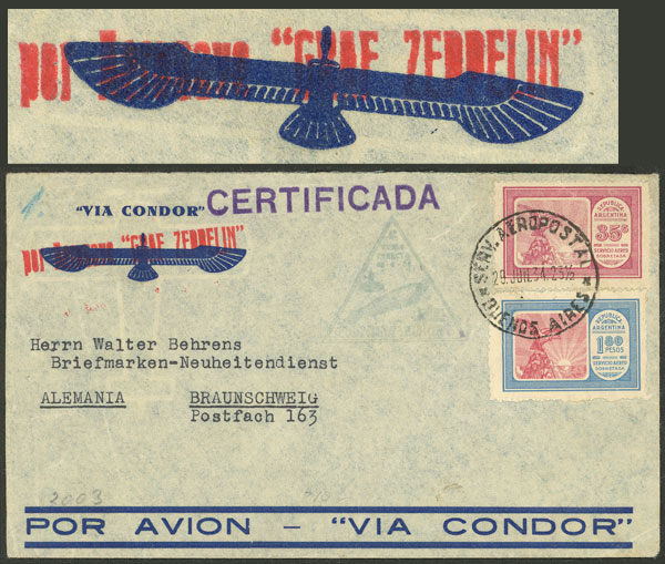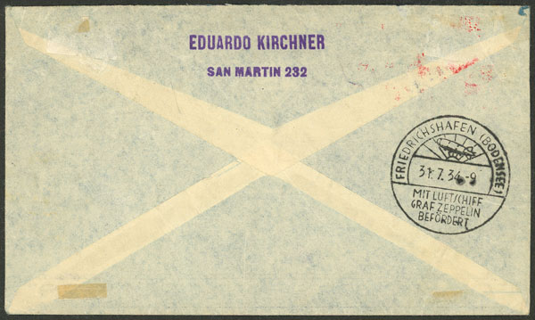 MB. 29/JUN/1934 Buenos Aires a Alemania, sobre aéreo enviado vía Zeppelin en el primer vuelo directo Argentina-Europa, con marca roja "por aeronave GRAF ZEPPELIN" (muy rara!), además marca tirangular del vuelo y al dorso arribo a Friedrichshafen el 31/JUL, MB!