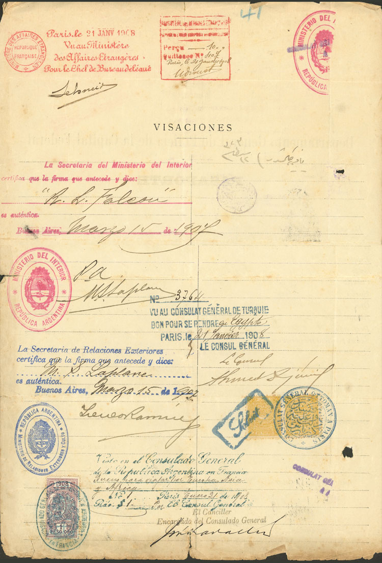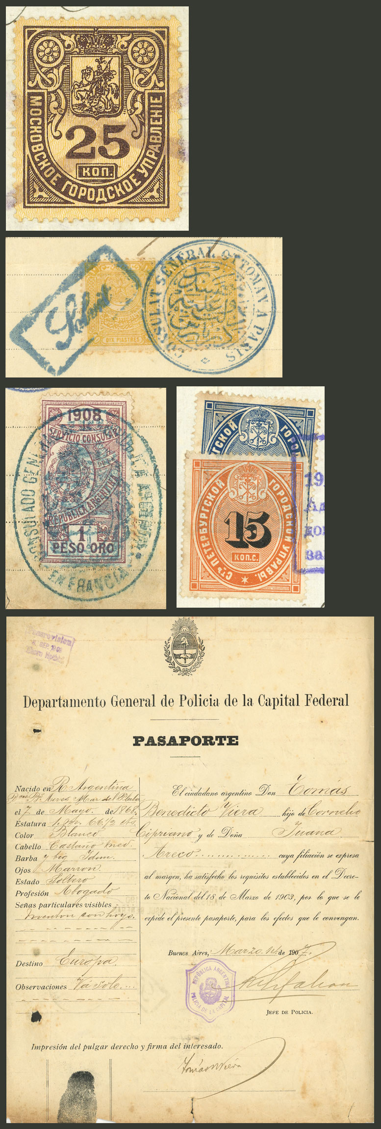 MB. Pasaporte otorgado en 1907 por la policía de la Capital Federal a un abogado que recorrió varios países, con unas cuantas visas y estampillas fiscales de Turquía, Argentina y Rusia, muy interesante y raro! ATENCIÓN: recomiendo mirar TODAS las fotos de este lote, todo su contenido está escaneado!