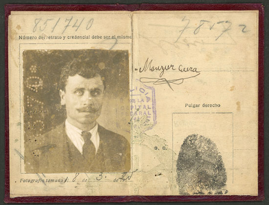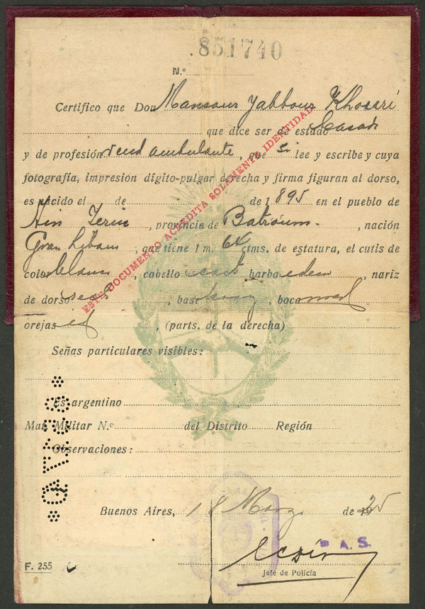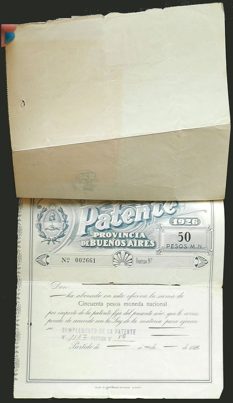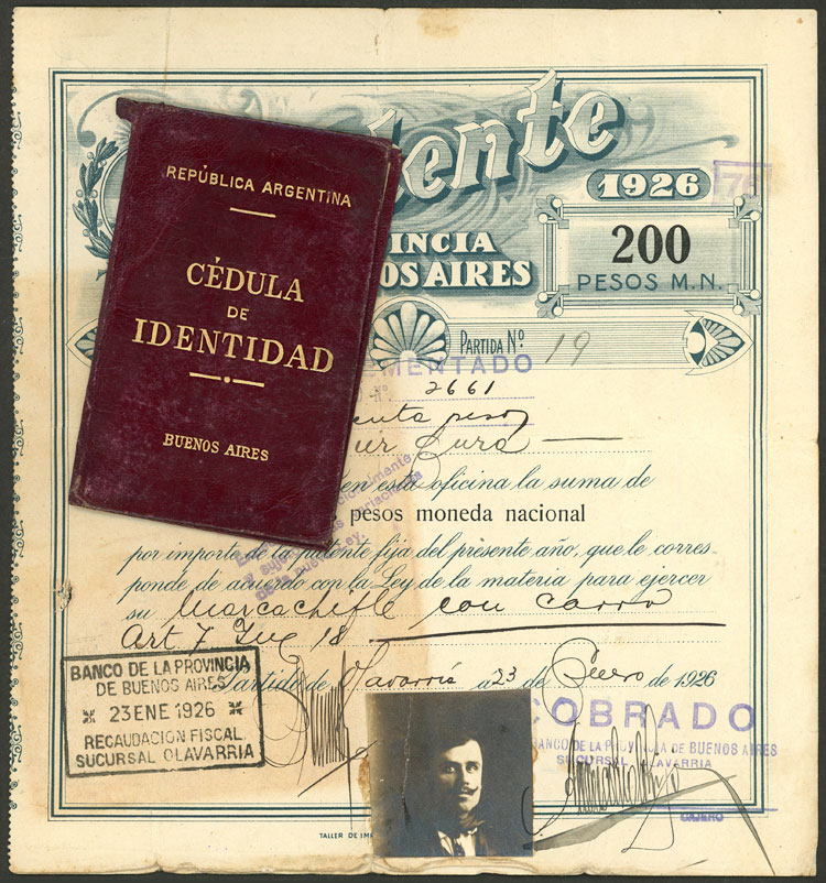 MB. Patente para un vendedor ambulante otrogada en Olavarría en 1926 sobre formulario de $200 y al dorso adherido un complemento de tarifa por $50, además incluímos el documento de identidad de este inmigrante nacido en Líbano, único y espectacular conjunto!