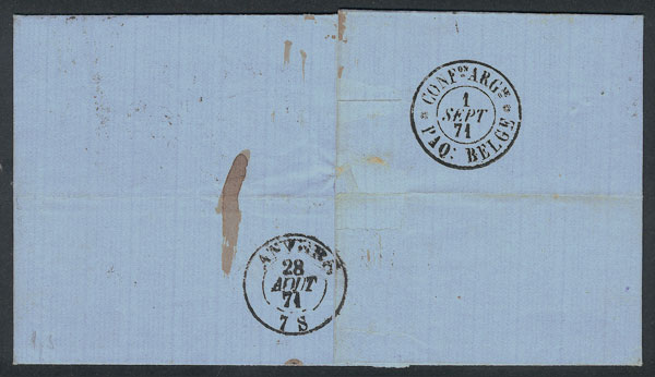 MB. 28/AGO/1871 LIÉGE - Argentina: Carta completa franqueada con 2x Sc.21 (Leopoldo I 40c. rosa dentado 15), matasello numeral "217" y fechador de Liege, "PD", y al dorso marca de la línea directa de vapores a Bs.Aires "CONFon. ARGne. PAQ. BELGE - 1/SEPT/71", muy buena calidad, muy raro!!