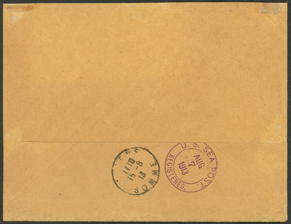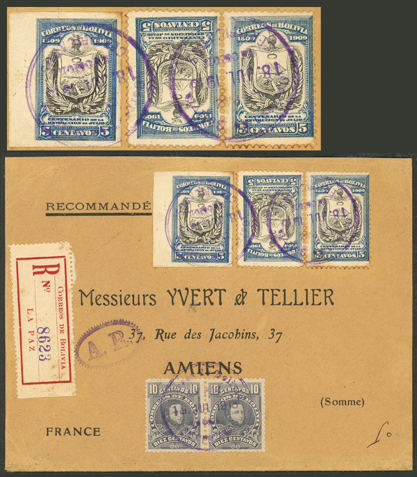 MB. Yvert 75 (Sc.78), 1909 5c. Escudo, sello SIN DENTAR + pareja TETE-BECHE + otros sellos (total 35c.) franqueando un frente de sobre (con parte del dorso) enviado certificado con A.R. el 18/JUL/1913 de La Paz a Francia, al dorso tiene tránsito por USA y arribo, MB calidad, rarísimo!!