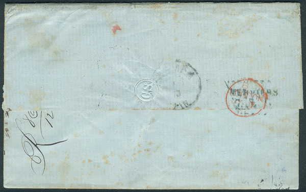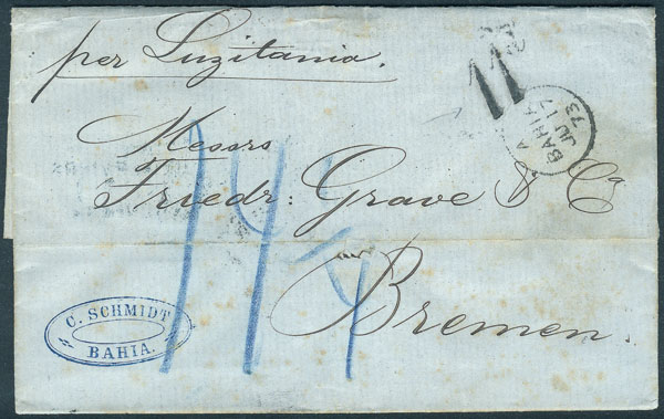 MB. 17/JUN/1873 Bahia - Alemania: Carta completa a Bremen con indicación "per Lisitania", con fechador en círculo chico de la Agencia Inglesa, y una muy bien colocada y rara marca "11d", + varias otras marcas de tasa, tránsito y arribo, muy buena calidad, rara!