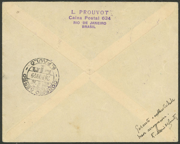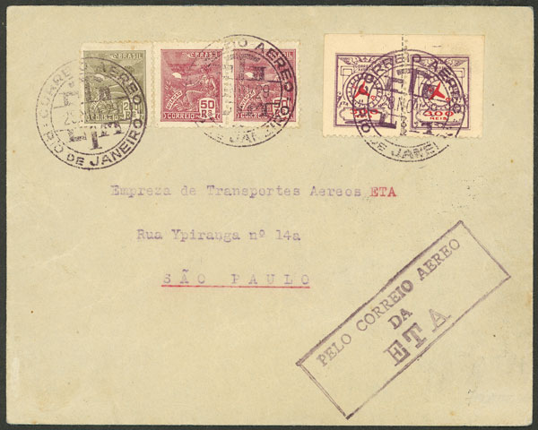 MB. 28/NOV/1929 Rio de Janeiro a Sao Paulo, sobre aéreo transportado por E.T.A. con franqueo ordinario de 300r. y sellos de la Empresa por 600rs. (pareja Sc.2CL"), arribo al dorso, MB calidad, raro!