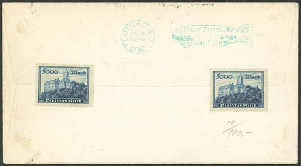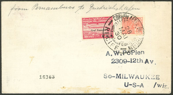 MB. 28/MAY/1930 Recife a USA, sobre enviado vía Zeppelin con franqueo ordinario de 300rs. y sobretasa aérea de 10.000rs. (Sc.4CL9), arribo al dorso, MB!