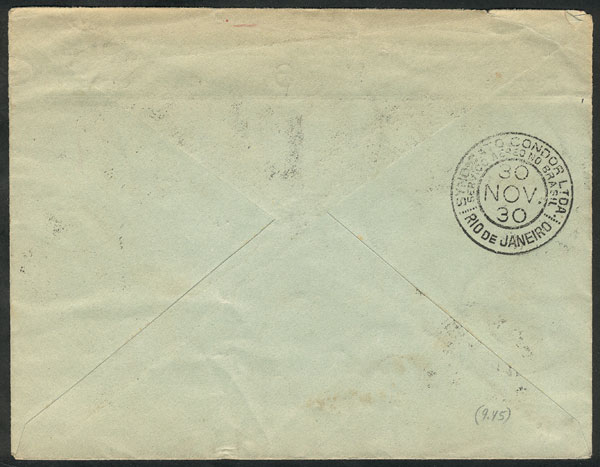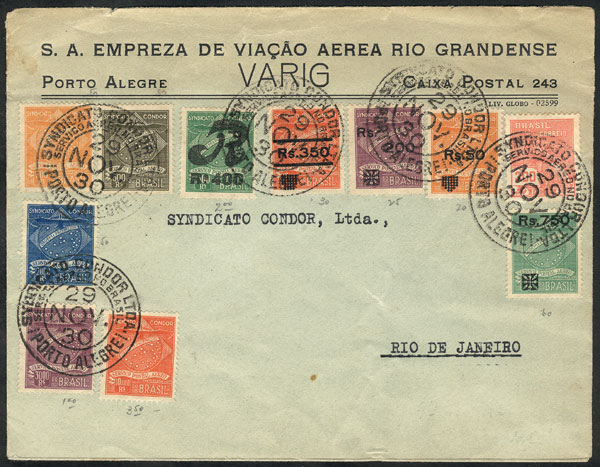 MB. Sobre aéreo enviado el 29/NOV/1930 de Porto Alegre a Rio de Janeiro, con espectacular franqueo multicolor que incluye Sc.1CLF3 (valor como usado US$600), muy buena calidad, raro!