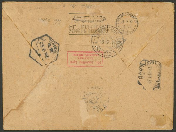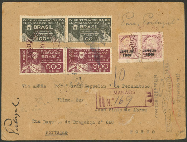 MB. Sobre certificado enviado el 6/SEP/1932 de Manaos a Portugal con franqueo ordinario de 1.400rs. + sobretasa de 14.000 rs. (pareja de Sc.C30), enviado vía Zeppelin en el 2º vuelo de Septiembre de 1932, al dorso tiene marcas varias de tránsito y arribo, MB!