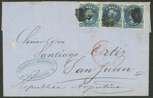 MB. 8/JUN/1868 Valparaíso a San Juan (Argentina), cubierta franqueada con 30c. (Yvert 14 x3) con matasellos mudos y acompaña fechador rojo, muy buena calidad!