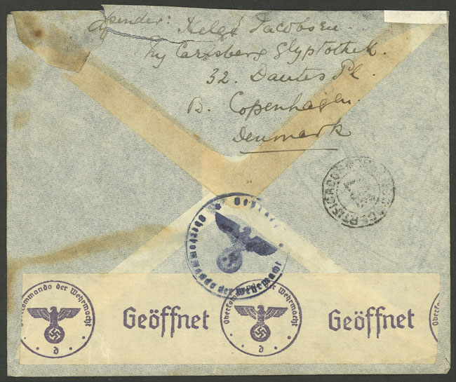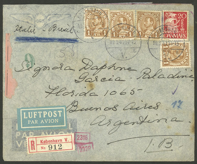 MB. 10/MAR/1941 Kovenhagen - Argentina, sobre aéreo certificado, "vía Italia-Brasil" (LATI), con franqueo de 4,20Kr., al dorso tiene censura nazi y marca de arribo a Buenos Aires, muy buena calidad!