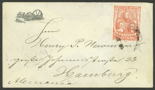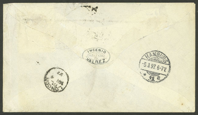 MB. Sobre franqueado con 20c. (Sc.67) enviado a Alemania, al dorso tiene marcas de tránsito por London (4/MAR/1897) y arribo a Hamburg (5/MAR), MB calidad!