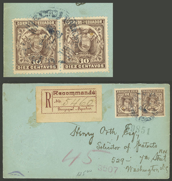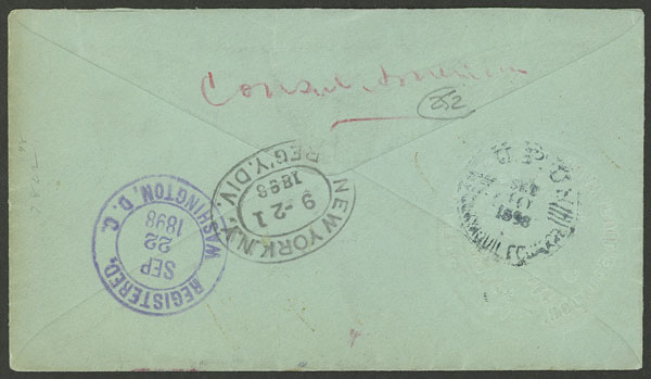 MB. Sobre con sello en relieve del Cónsul General Estadounidense, enviada certificada el 10/SEP/1898 de Guayaquil a USA con franqueo de 20c. (pareja Sc.58), al dorso tránsito por N.York el 21/SEP y arribo a Washington el 22, excelente calidad!