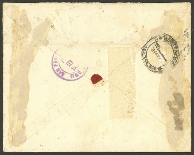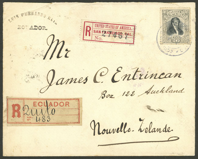 MB. RARO DESTINO: Sobre certificado enviado el 2/ABR/1902 de Quito a Nueva Zelanda con franqueo de 20c. (Sc.149), al dorso tránsito por San Francisco (20/ABR) y arribo a Auckland (21/MAY), MB calidad!