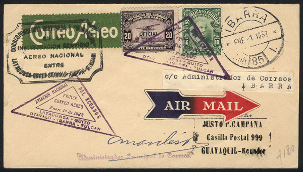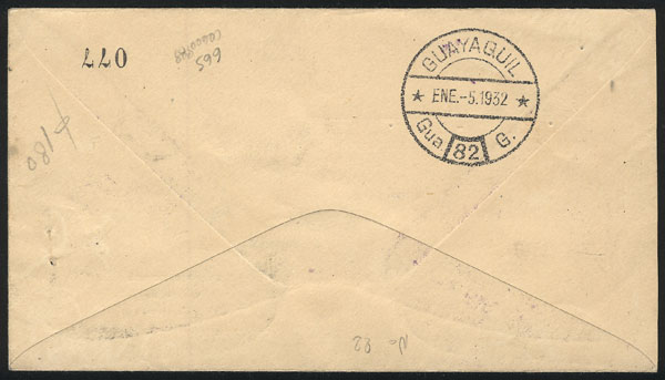 MB. 1/ENE/1932 Ibarra - Guayaquil, sobre transportado en el vuelo inaugural Latacunga - Quito - Otavalo - Ibarra - Tulcan, al dorso marca de arribo el 5/ENE, excelente calidad, raro!